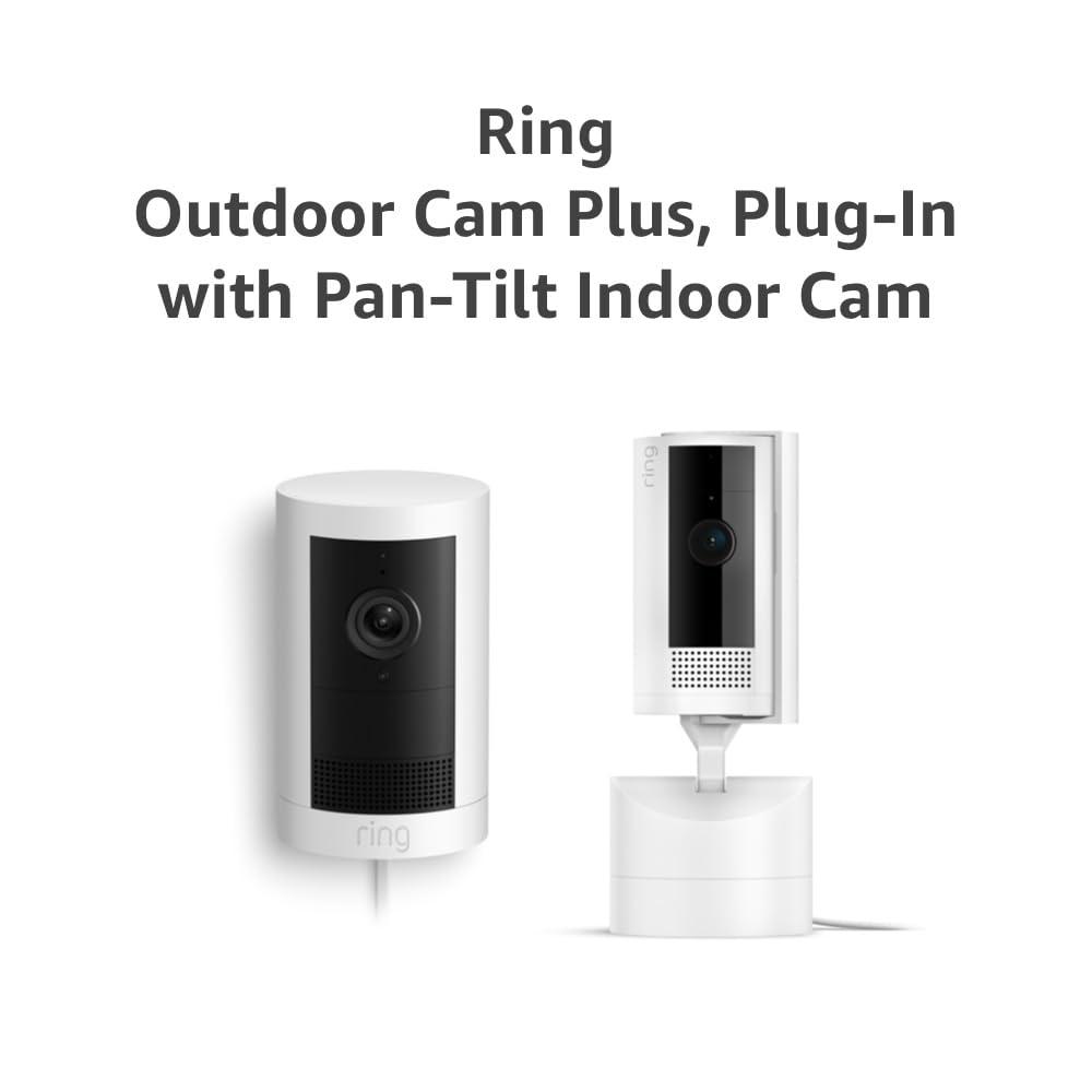This bundle contains Ring Outdoor Cam Plus, Battery (White) and Ring Pan-Tilt Indoor Cam (White).
