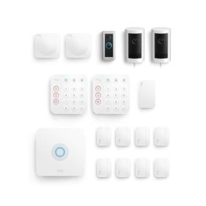 This bundle contains one Ring Alarm 14-Piece Kit, one Ring Wired Doorbell Pro, two Ring Outdoor Cam Plus, Battery (White), and two Ring Solar Panel (2nd generation).
