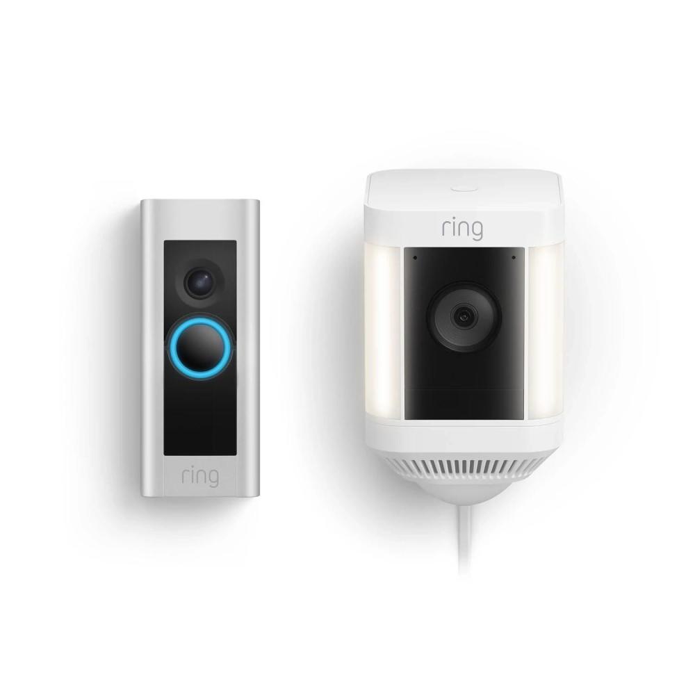 This bundle contains one Ring Wired Doorbell Plus with one Ring Spotlight Cam Plus, Plug-In White.